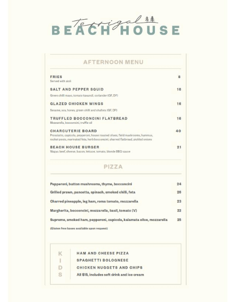 Terrigal Beach House Afternoon Menu